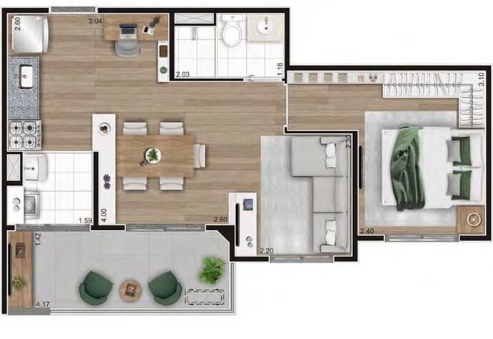 1 Dormitório1 Banheiro1 Cozinha1 Sala de jantar1 Sala de estar1 Área de serviço