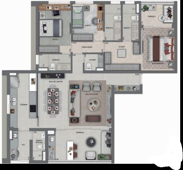 3 Dormitórios, sendo 3 suítes1 Banheiro2 VagasGaragem Coberta1 Sala de TV1 Cozinha1 Sala de jantar1 Sala de estar1 Área de serviço