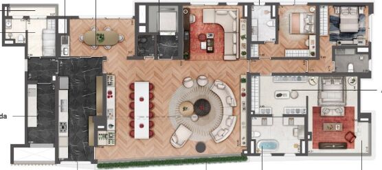 Apartamento com 264m², 3 quartos, todos suítes, e uma vaga de garagem para cada 132m² de área útil. A sala de estar é ampla e integrada com a varanda gourmet, proporcionando momentos agradáveis com a família e amigos. Além disso, o imóvel conta com um escritório, perfeito para quem busca um espaço tranquilo para trabalhar ou estudar em casa.