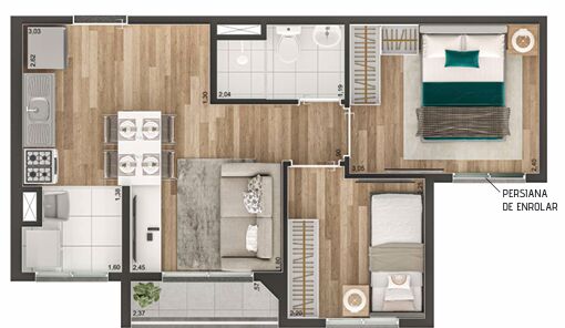 2 Dormitórios1 Banheiro1 Cozinha1 Sala de jantar1 Sala de estar1 Área de serviço