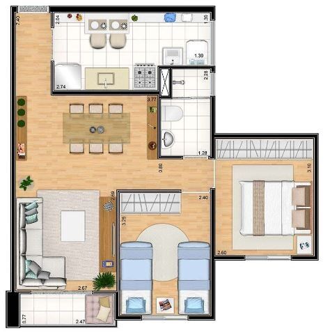 2 Dormitórios1 Banheiro1 Cozinha1 Sala de jantar1 Sala de estar1 Área de serviço